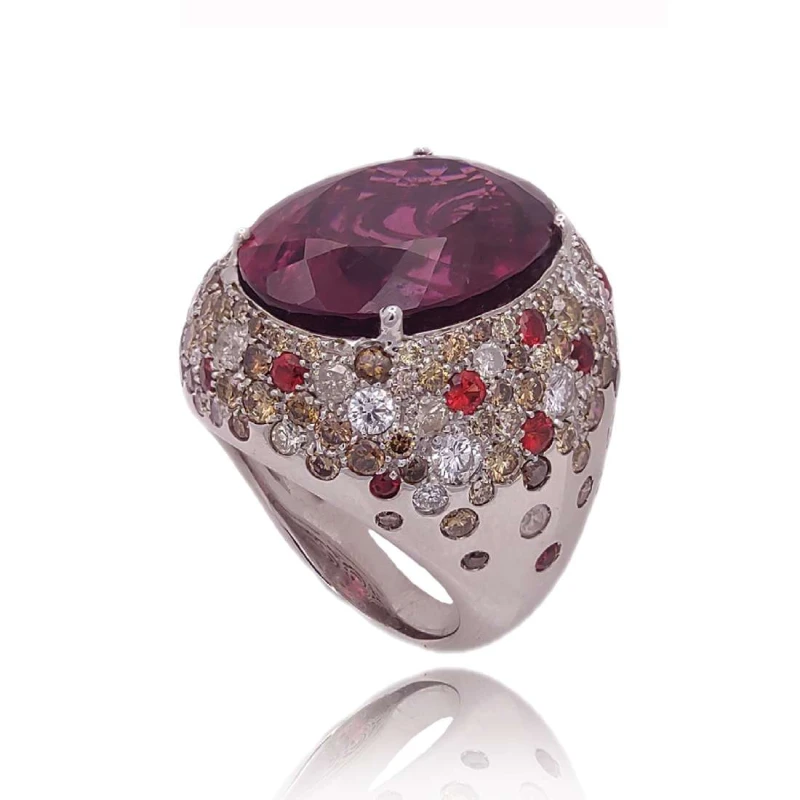 Anel Em Ouro Branco, Rubelita, Safiras E Diamantes