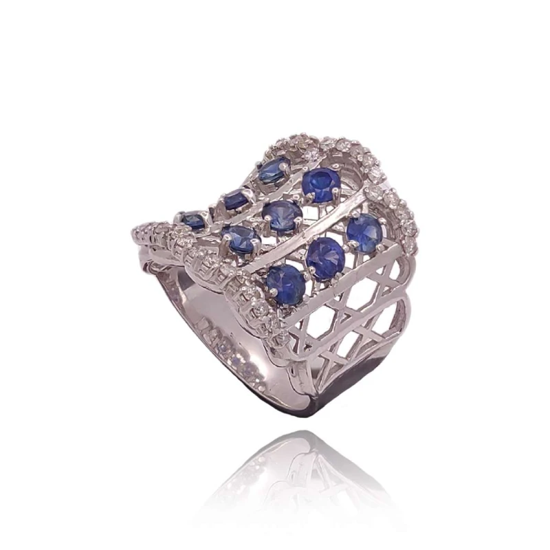 anel ouro branco, safiras e diamantes