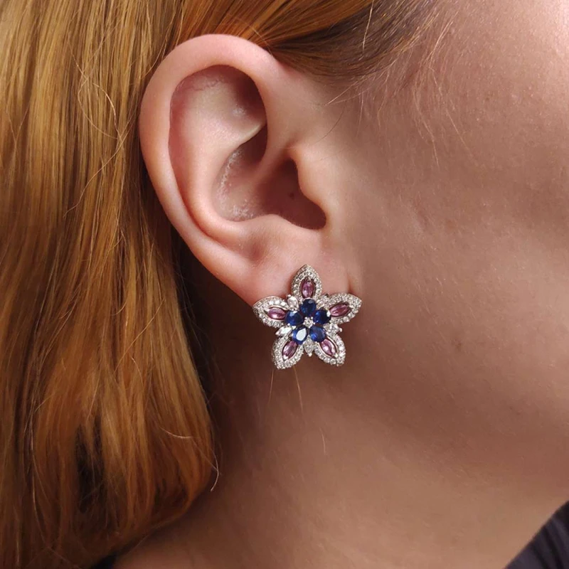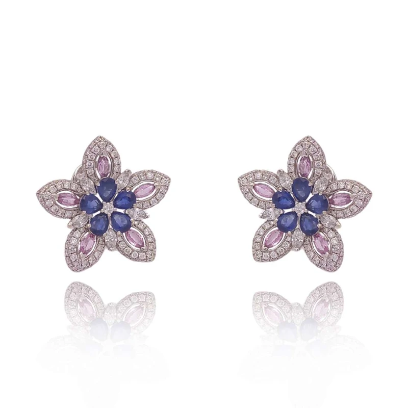 Pedras: 1,25 quilates de Safiras rosas e azuis e 87 pontos de diamantes